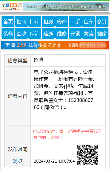 电子公司招聘检验员,设备操作岗,三班倒有五险一金、加班费、周末补贴、年底14薪、包吃住等各项福利,有意联系童女士:15230860760(同微信) 【电话咨询时,请一定说明在宁晋123看到的,谢谢!】 |