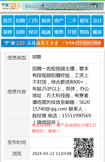 招聘一名短视频主播,要求有段视频拍摄经验,工资上不封顶,综合薪资8000+,年龄25岁以上,双休,办公地址:方大科技园,有意者请将简历投放至邮箱:562015740@qq.com 联系人:赵经理 电话:15511990569(微信同号) 【电话咨询时,请一定说明在宁晋123看到的,谢谢!】 |