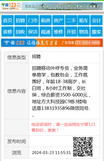招聘移动外呼专员,业务简单易学,包教包会,工作氛围好,年龄18-38周岁,长白班,8小时工作制,交社保,综合薪资3500-6000元,地址方大科技园C9栋3楼电话是13831935896微信同号