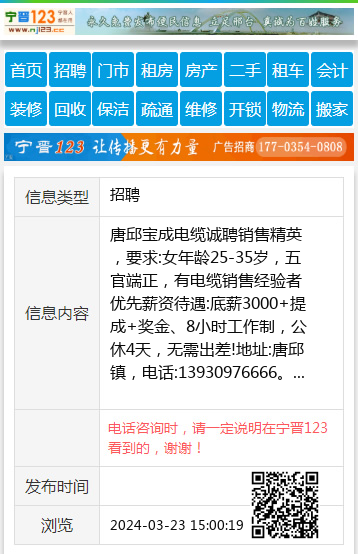 唐邱宝成电缆诚聘销售精英,要求:女年龄25-35岁,五官端正,有电缆销售经验者优先薪资待遇:底薪3000+提成+奖金、8小时工作制,公休4天,无需出差!地址:唐邱镇,电话:13930976666。 【电话咨询时,请一定说明在宁晋123看到的,谢谢!】 |