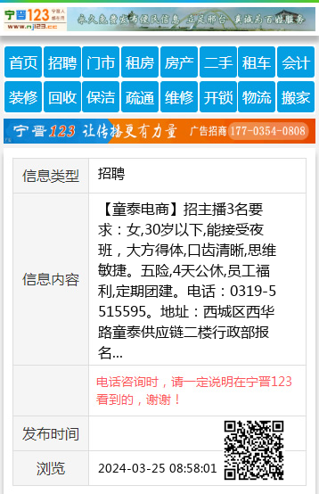 【童泰电商】招主播3名要求:女,30岁以下,能接受夜班,大方得体,口齿清晰,思维敏捷。五险,4天公休,员工福利,定期团建。电话:0319-5515595。地址:西城区西华路童泰供应链二楼行政部报名 【电话咨询时,请一定说明在宁晋123看到的,谢谢!】 |