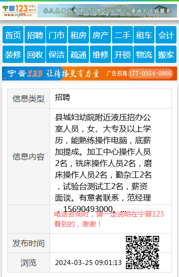县城妇幼院附近液压招办公室人员,女、大专及以上学历,能熟练操作电脑,底薪加提成。加工中心操作人员2名,铣床操作人员2名,磨床操作人员2名,勤杂工2名,试验台测试工2名,薪资面谈。有意者联系,范经理,15690493000。 【电话咨询时,请一定说明在宁晋123看到的,谢谢!】 |
