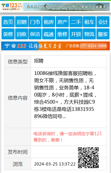 10086接线挽留客服招聘啦,男女不限,无销售性质,无销售性质,业务简单,18-40周岁,8小时,底薪+提成,综合4500+,方大科技园C9栋3楼电话是电话13831935896微信同号 【电话咨询时,请一定说明在宁晋123看到的,谢谢!】 |