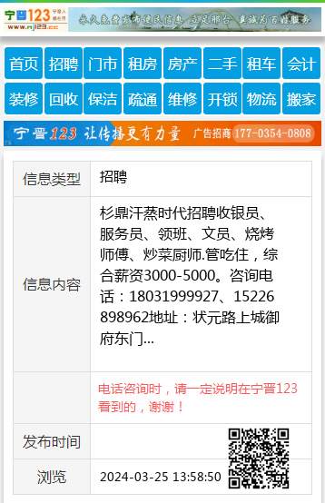 | 防骗提醒: | 宁晋123(www.nj123.cc)提醒您:手工活、网络兼职、刷单,都是骗子!凡以各种名义收取费用的都是骗子!找工作是往兜里挣钱,让你往外掏钱的都是骗子!异地招聘请提高警惕,谨防诈骗! |
