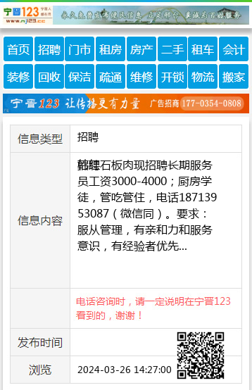 韩红石板肉现招聘长期服务员工资3000-4000;厨房学徒,管吃管住,电话18713953087(微信同)。要求:服从管理,有亲和力和服务意识,有经验者优先 【电话咨询时,请一定说明在宁晋123看到的,谢谢!】 |