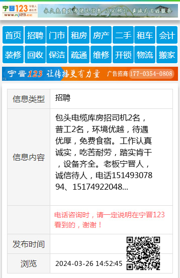 包头电缆库房招司机2名,普工2名,环境优越,待遇优厚,免费食宿。工作认真诚实,吃苦耐劳,踏实肯干,设备齐全。老板宁晋人,诚信待人,电话15149307894、15174922048