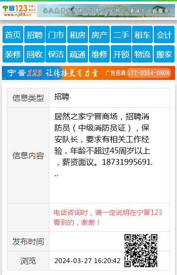 居然之家宁晋商场,招聘消防员(中级消防员证),保安队长,要求有相关工作经验,年龄不超过45周岁以上,薪资面议。18731995691 【电话咨询时,请一定说明在宁晋123看到的,谢谢!】 |