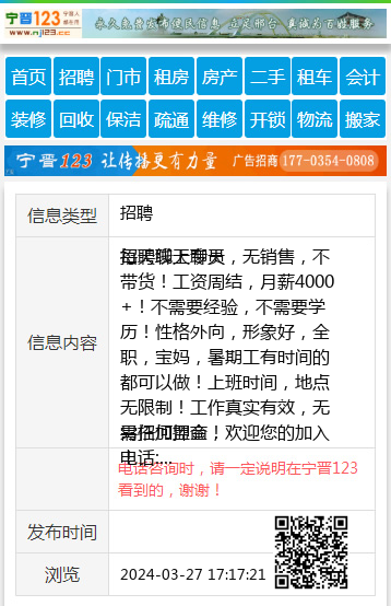 | 防骗提醒: | 宁晋123(www.nj123.cc)提醒您:手工活、网络兼职、刷单,都是骗子!凡以各种名义收取费用的都是骗子!找工作是往兜里挣钱,让你往外掏钱的都是骗子!异地招聘请提高警惕,谨防诈骗! |