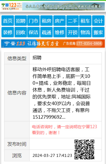 移动外呼招聘电话客服,工作简单易上手,底薪一天100+提成,业务稳定,每周日休息,新人免费培训,干过的优先录取,地址:凤城国际,要求女40岁以内,会说普通话,不拖欠工资,有意向15127999692 【电话咨询时,请一定说明在宁晋123看到的,谢谢!】 |