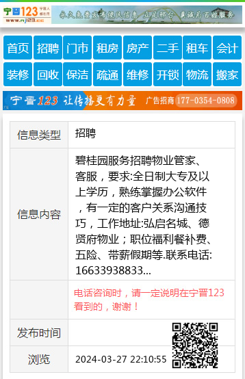 碧桂园服务招聘物业管家、客服,要求:全日制大专及以上学历,熟练掌握办公软件,有一定的客户关系沟通技巧,工作地址:弘启名城、德贤府物业;职位福利餐补费、五险、带薪假期等.联系电话:16633938833 【电话咨询时,请一定说明在宁晋123看到的,谢谢!】 |