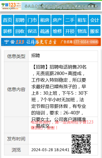 【招聘】招聘电话销售20名,无责底薪2800+高提成,工作收入特别稳定,所以要求最好是已婚有孩子的,早上8:30上班,下午5:30下班,7个半小时无加班,法定节假日带薪休假,有专业的培训,要求:26-40岁,只要女士。公司客户源精准,易成交。工作地点:老车站正泰大厦,联系电话:15369992789 【电话咨询时,请一定说明在宁晋123看到的,谢谢!】 |