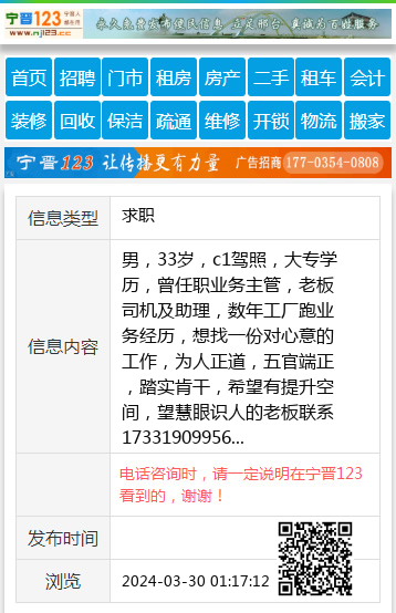 男,33岁,c1驾照,大专学历,曾任职业务主管,老板司机及助理,数年工厂跑业务经历,想找一份对心意的工作,为人正道,五官端正,踏实肯干,希望有提升空间,望慧眼识人的老板联系17331909956 【电话咨询时,请一定说明在宁晋123看到的,谢谢!】 |