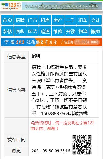 招聘:电缆销售专员,要求女性格开朗做过销售有团队意识已婚已育者优先。工资待遇:底薪+提成综合薪资五千+,上不封顶,只要你有能力,工资一切不是问题,有强烈挣钱欲望有意者联系:15028882664非诚勿扰 【电话咨询时,请一定说明在宁晋123看到的,谢谢!】 |
