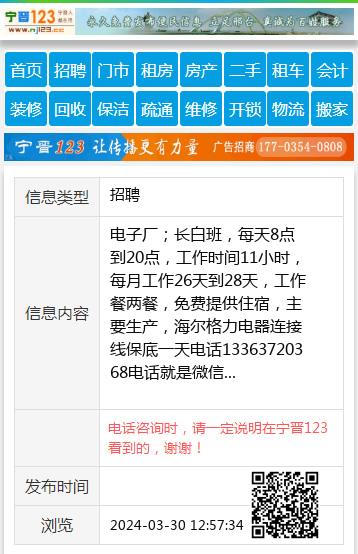 电子厂;长白班,每天8点到20点,工作时间11小时,每月工作26天到28天,工作餐两餐,免费提供住宿,主要生产,海尔格力电器连接线保底一天电话13363720368电话就是微信 【电话咨询时,请一定说明在宁晋123看到的,谢谢!】 |