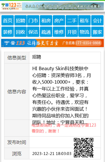 HI Beauty Skin科技美肤中心招聘:资深美容师3名,月收入5000-10000+,要求:有一年以上工作经验,并真心热爱这份职业,爱学习,有责任心。待遇优,欢迎有兴趣的小伙伴来咨询面试!期待同品味的你加入我们的团队!地址:宁晋县天和城南门西行100米路北Hibeauty科技美肤中心,电话:15933711456 【电话咨询时,请一定说明在宁晋123看到的,谢谢!】 |