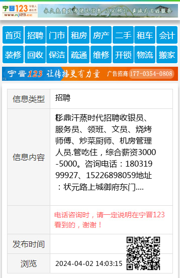 杉鼎汗蒸时代招聘收银员、服务员、领班、文员、烧烤师傅、炒菜厨师、机房管理人员.管吃住,综合薪资3000-5000。咨询电话:18031999927、15226898059地址:状元路上城御府东门. 【电话咨询时,请一定说明在宁晋123看到的,谢谢!】 |