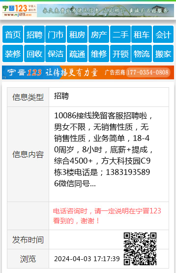 10086接线挽留客服招聘啦,男女不限,无销售性质,无销售性质,业务简单,18-40周岁,8小时,底薪+提成,综合4500+,方大科技园C9栋3楼电话是;13831935896微信同号