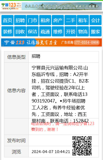 宁晋县元兴运输有限公司.山东临沂专线,招聘:A2开半挂,招在公司提货C1、B2本司机,驾驶经验在2年以上者,工资面议,联系电话13903192047。◆另牛场招聘工人2名,有养牛经验者优先,工资面议,地址:西王里村南,联系电话:15284299988 【电话咨询时,请一定说明在宁晋123看到的,谢谢!】 |