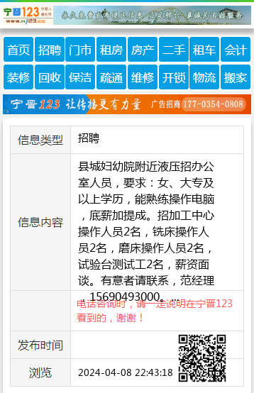 县城妇幼院附近液压招办公室人员,要求:女、大专及以上学历,能熟练操作电脑,底薪加提成。招加工中心操作人员2名,铣床操作人员2名,磨床操作人员2名,试验台测试工2名,薪资面谈。有意者请联系,范经理,15690493000。