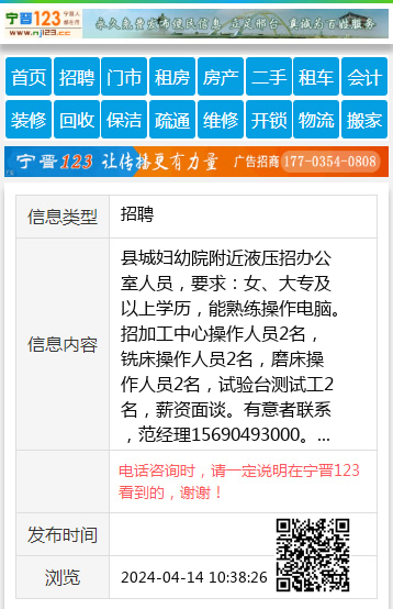 县城妇幼院附近液压招办公室人员,要求:女、大专及以上学历,能熟练操作电脑。招加工中心操作人员2名,铣床操作人员2名,磨床操作人员2名,试验台测试工2名,薪资面谈。有意者联系,范经理15690493000。 【电话咨询时,请一定说明在宁晋123看到的,谢谢!】 |