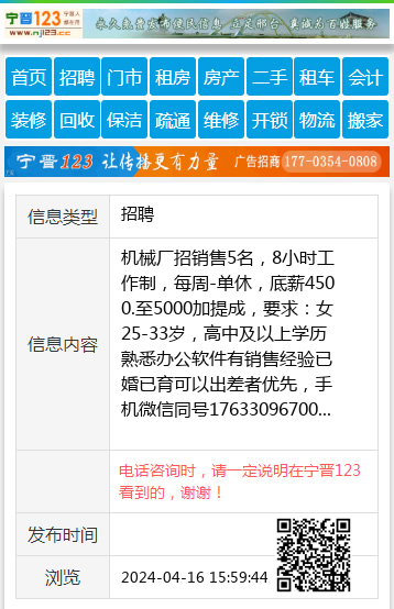 机械厂招销售5名,8小时工作制,每周-单休,底薪4500.至5000加提成,要求:女25-33岁,高中及以上学历熟悉办公软件有销售经验已婚已育可以出差者优先,手机微信同号17633096700 【电话咨询时,请一定说明在宁晋123看到的,谢谢!】 |