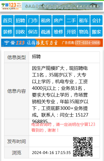 因生产规模扩大,现招聘电工1名,35周岁以下,大专以上学历,机电专业,工资4000元以上;业务员1名,要求大专以上学历,市场营销相关专业,年龄35周岁以下,工资底薪3000+业务提成。联系人:闫女士 15127968895 【电话咨询时,请一定说明在宁晋123看到的,谢谢!】 |