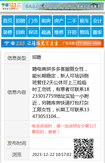 聘电商拼多多客服限女性,能长期稳定,新人可培训倒班管住2天公休可上三险临时工勿扰,有意者可联系18233017759地址实验一小附近,另聘库房快递打包打杂工限女性,长期工可联系13473053104 【电话咨询时,请一定说明在宁晋123看到的,谢谢!】 |