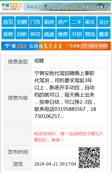 宁晋安胜代驾招聘晚上兼职代驾员,司机要求驾龄3年以上,熟悉开手动挡,自动档的就可以,每天晚上出来,按单日结,可以挣2-3百,联系电话03195885567,18730106257 【电话咨询时,请一定说明在宁晋123看到的,谢谢!】 |