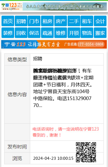 薪资待遇:底薪+绩效+定期团建+节日福利,月休四天。地址宁晋县天宝东街104号中路保险。电话15132900770 【电话咨询时,请一定说明在宁晋123看到的,谢谢!】 |
