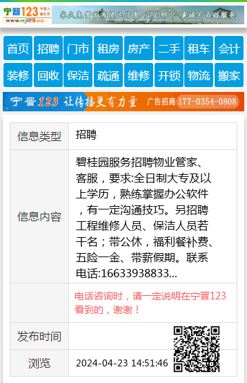 碧桂园服务招聘物业管家、客服,要求:全日制大专及以上学历,熟练掌握办公软件,有一定沟通技巧。另招聘工程维修人员、保洁人员若干名;带公休,福利餐补费、五险一金、带薪假期。联系电话:16633938833 【电话咨询时,请一定说明在宁晋123看到的,谢谢!】 |