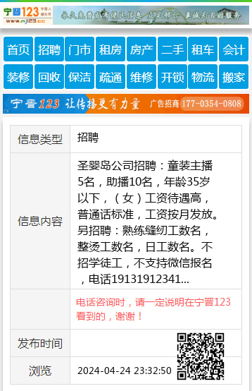 圣婴岛公司招聘:童装主播5名,助播10名,年龄35岁以下,(女)工资待遇高,普通话标准,工资按月发放。另招聘:熟练缝纫工数名,整烫工数名,日工数名。不招学徒工,不支持微信报名,电话19131912341 【电话咨询时,请一定说明在宁晋123看到的,谢谢!】 |