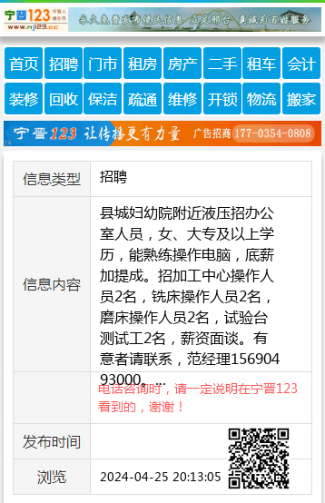 | 防骗提醒: | 宁晋123(www.nj123.cc)提醒您:手工活、网络兼职、刷单,都是骗子!凡以各种名义收取费用的都是骗子!找工作是往兜里挣钱,让你往外掏钱的都是骗子!异地招聘请提高警惕,谨防诈骗! |