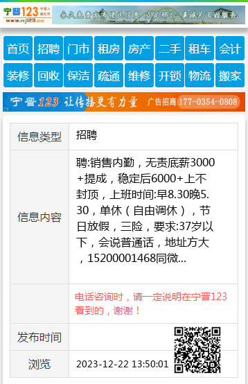聘:销售内勤,无责底薪3000+提成,稳定后6000+上不封顶,上班时间:早8.30晚5.30,单休(自由调休),节日放假,三险,要求:37岁以下,会说普通话,地址方大,15200001468同微 【电话咨询时,请一定说明在宁晋123看到的,谢谢!】 |