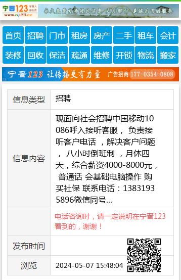现面向社会招聘中国移动10086呼入接听客服, 负责接听客户电话 ,解决客户问题, 八小时倒班制 ,月休四天,综合薪资4000-8000元, 普通话 会基础电脑操作 购买社保 联系电话:13831935896微信同号 【电话咨询时,请一定说明在宁晋123看到的,谢谢!】 |