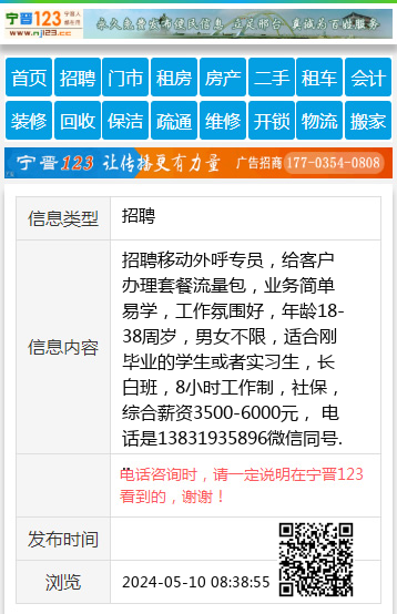 招聘移动外呼专员,给客户办理套餐流量包,业务简单易学,工作氛围好,年龄18-38周岁,男女不限,适合刚毕业的学生或者实习生,长白班,8小时工作制,社保,综合薪资3500-6000元, 电话是13831935896微信同号 【电话咨询时,请一定说明在宁晋123看到的,谢谢!】 |