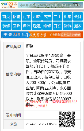 宁晋享代驾平台招聘晚上兼职、全职代驾员,司机要求驾龄3年以上,熟悉开手动挡,自动档的就可以,每天晚上出来,按单日结,日收入200-300百,公司提供专业培训和副业扶持,多方面收益让你兼职收入达到5000以上,联系电话18233009789