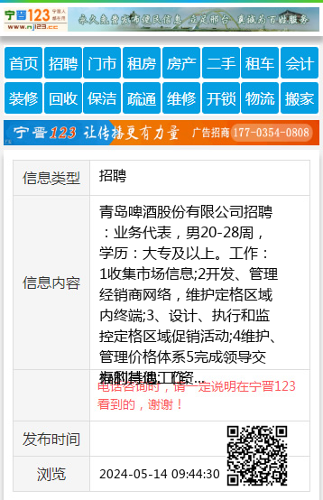 青岛啤酒股份有限公司招聘:业务代表,男20-28周,学历:大专及以上。工作:1收集市场信息;2开发、管理经销商网络,维护定格区域内终端;3、设计、执行和监控定格区域促销活动;4维护、管理价格体系5完成领导交办的其他工作;
