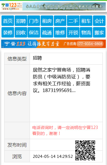 居然之家宁晋商场,招聘消防员(中级消防员证),要求有相关工作经验,薪资面议。18731995691