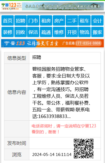 碧桂园服务招聘物业管家、客服,要求:全日制大专及以上学历,熟练掌握办公软件,有一定沟通技巧。另招聘工程维修人员、保洁人员若干名。带公休,福利餐补费、五险一金、带薪假期·联系电话:16633938833 【电话咨询时,请一定说明在宁晋123看到的,谢谢!】 |