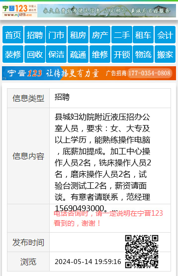 县城妇幼院附近液压招办公室人员,要求:女、大专及以上学历,能熟练操作电脑,底薪加提成。加工中心操作人员2名,铣床操作人员2名,磨床操作人员2名,试验台测试工2名,薪资请面谈。有意者请联系,范经理15690493000。 【电话咨询时,请一定说明在宁晋123看到的,谢谢!】 |