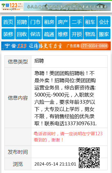 急聘!美团团购招聘啦!不是外卖!招聘岗位:美团团购运营业务员,综合薪资待遇:5000元-9000元,入职就交六险一金,要求年龄33岁以下,大专及以上学历,男女不限,有销售经验的优先录取!联系电话13373097631 【电话咨询时,请一定说明在宁晋123看到的,谢谢!】 |