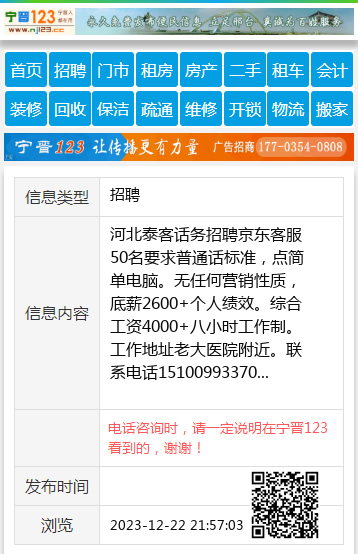 | 防骗提醒: | 宁晋123(www.nj123.cc)提醒您:手工活、网络兼职、刷单,都是骗子!凡以各种名义收取费用的都是骗子!找工作是往兜里挣钱,让你往外掏钱的都是骗子!异地招聘请提高警惕,谨防诈骗! |