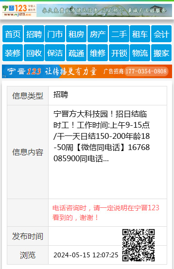 宁晋方大科技园!招日结临时工!工作时间:上午9-15点/干一天日结150-200年龄18-50周【微信同电话】16768085900同电话 【电话咨询时,请一定说明在宁晋123看到的,谢谢!】 |