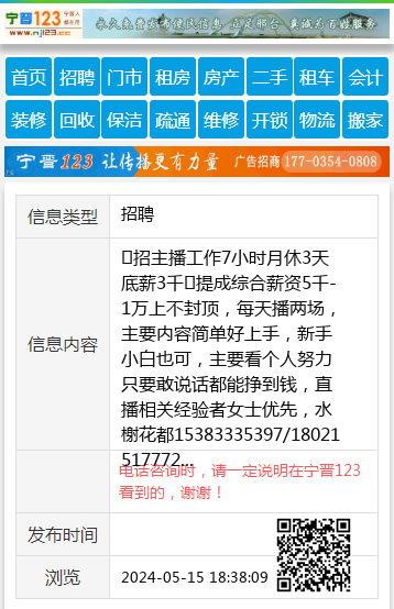 ✅招主播工作7小时月休3天底薪3千➕提成综合薪资5千-1万上不封顶,每天播两场,主要内容简单好上手,新手小白也可,主要看个人努力只要敢说话都能挣到钱,直播相关经验者女士优先,水榭花都15383335397/18021517772 【电话咨询时,请一定说明在宁晋123看到的,谢谢!】 |