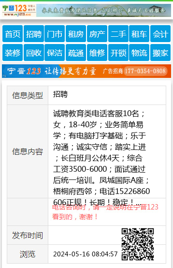 诚聘教育类电话客服10名;女,18-40岁;业务简单易学;有电脑打字基础;乐于沟通;诚实守信;踏实上进;长白班月公休4天;综合工资3500-6000;面试通过后统一培训。凤城国际A座;梧桐府西邻;电话15226860606正规!长期!稳定! 【电话咨询时,请一定说明在宁晋123看到的,谢谢!】 |