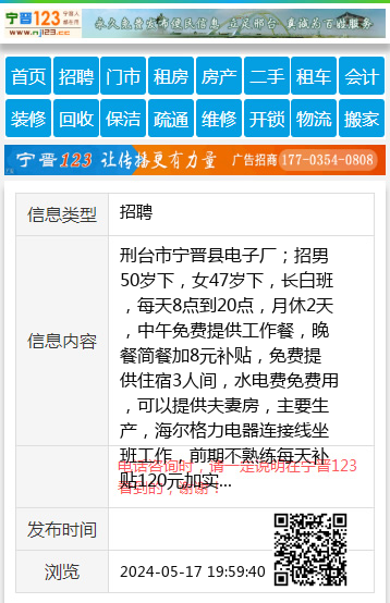 刑台市宁晋县电子厂;招男50岁下,女47岁下,长白班,每天8点到20点,月休2天,中午免费提供工作餐,晚餐简餐加8元补贴,免费提供住宿3人间,水电费免费用,可以提供夫妻房,主要生产,海尔格力电器连接线坐班工作,前期不熟练每天补贴120元加实际计件金额,后期熟练计件,每月工资5500元到6500元,(另辅助岗位招女50岁到60岁)(另包装车间招男50岁下计时制)坐满5天以上有工资,可以少量安排不认识字人员。可以预支。
