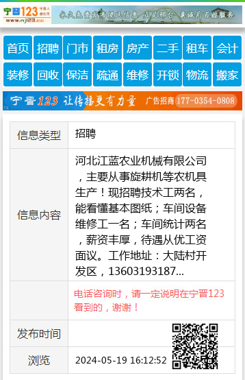 河北江蓝农业机械有限公司,主要从事旋耕机等农机具生产!现招聘技术工两名,能看懂基本图纸;车间设备维修工一名;车间统计两名,薪资丰厚,待遇从优工资面议。工作地址:大陆村开发区,13603193187 【电话咨询时,请一定说明在宁晋123看到的,谢谢!】 |