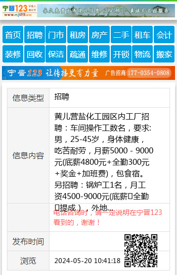 黄儿营盐化工园区内工厂招聘:车间操作工数名,要求:男,25-45岁,身体健康,吃苦耐劳,月薪5000-9000元(底薪4800元+全勤300元+奖金+加班费),包食宿。另招聘:锅炉工1名,月工资4500-9000元(底薪➕全勤➕提成),外地锅炉工,月工资5000元。联系电话15343199088,18103395878 【电话咨询时,请一定说明在宁晋123看到的,谢谢!】 |