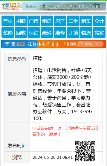 招聘:电话销售,社保+6天公休,底薪3000+200全勤+提成,节假日放假,女,有销售经验,年龄38以下,普通话,善于沟通,学习能力强,热爱销售工作,会基础办公软件,方大,19133997100 【电话咨询时,请一定说明在宁晋123看到的,谢谢!】 |