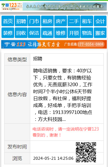 聘电话销售,要求:40岁以下,只要女性,有销售经验优先,无责底薪3200,工作时间7个半小时公休6天节假日放假,有社保,福利好提成高,好成单,手把手培训,电话:19133997100地点:方大科技园